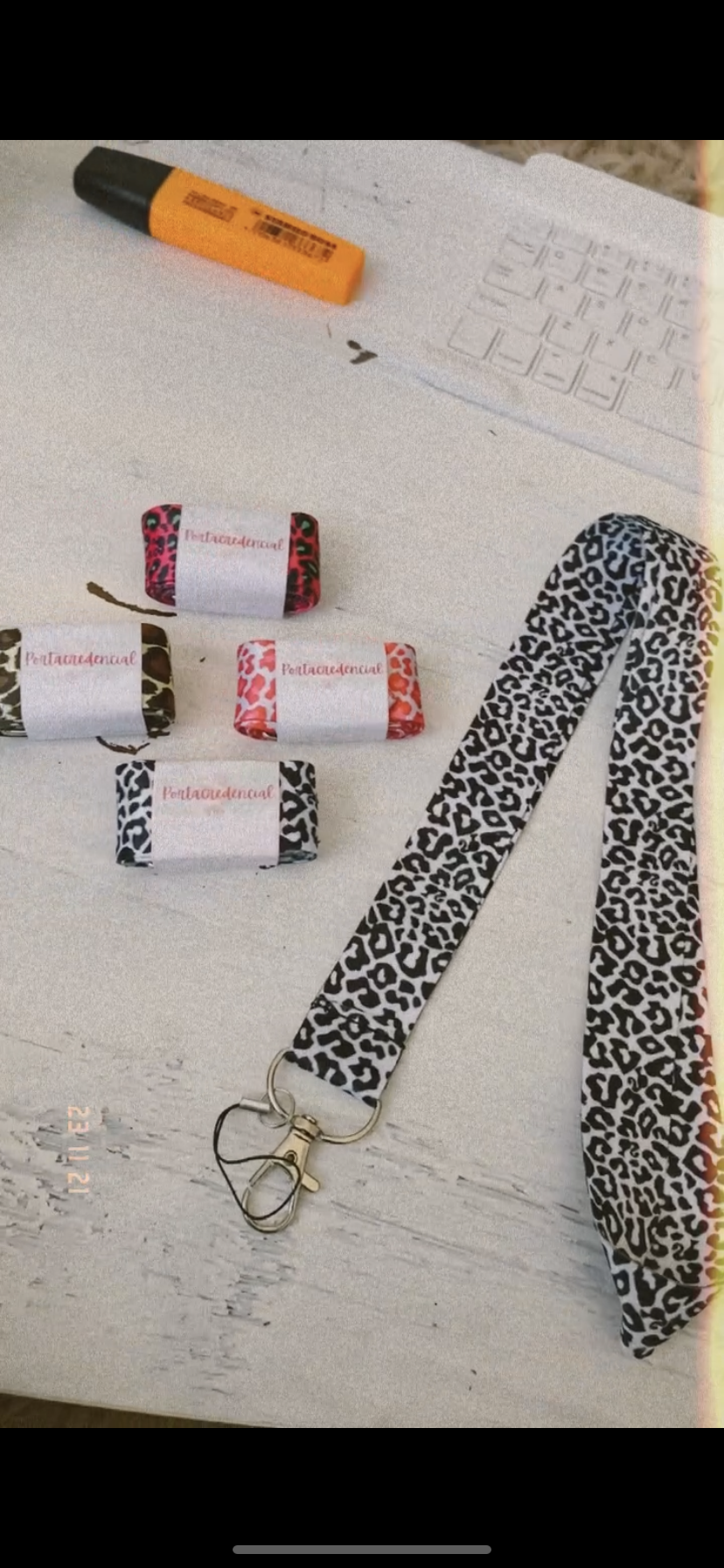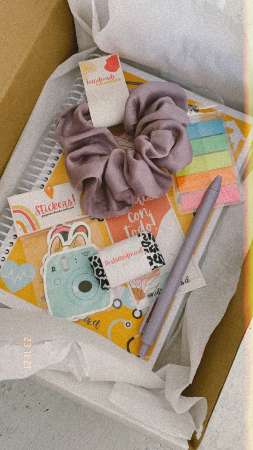 + Scrunchie morado-Lapiz tinta-Portacredencial -Set stickers (5 unidades)-Post it fluor-Separador de páginas.