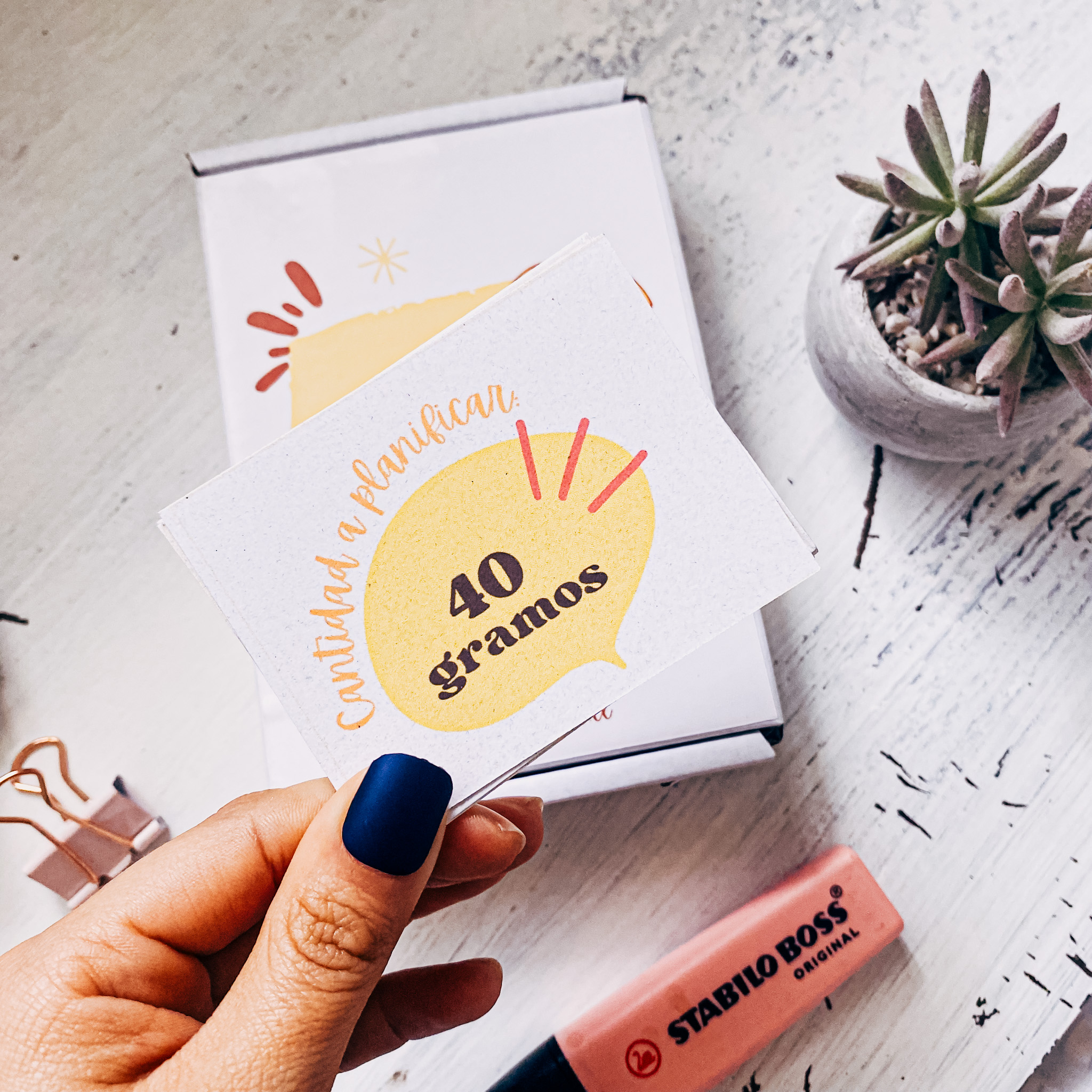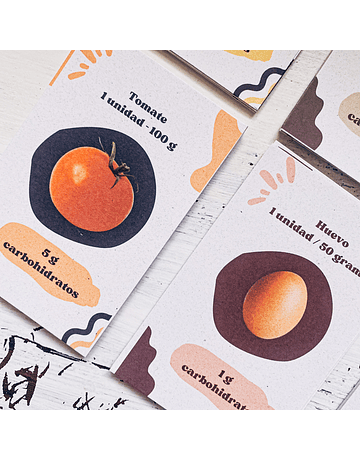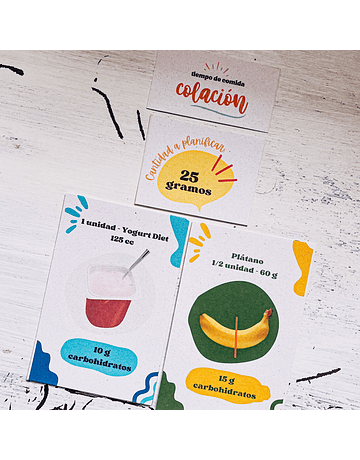 Contiene 68 láminas de alimentos, cada uno de ellos con su porción (en medidas caseras y gramos) y además la cantidad de gramos carbohidratos por porción de alimentos, 5 láminas de tiempo de comida y 10 láminas de cantidad de carbohidratos a planificar por tiempo de comida. Todo esto viene en una caja para que pueda ser guardado y transportado. Las láminas son de 200 gramos. - ¿Cómo se usa?